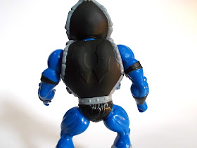 The major standout, for me, is finally seeing the show accurate colour for his skin tone. The old gray is replaced with a lovely royal blue, the face no longer has the warts on the forehead and looks more angular than the original. It's hard to appreciate the detail as white paint is quite thick and obscures some of the sculpt. Aside from the new head, and horde armbands on both arms, sans horde logo, some ribbing detail on the armour, and logoless boots, what you're getting is the original Hordak figure, which means there is a bit of a Filmation omission in his boots. They just look soft compared to the metal flippers the cartoon model had. Though not an obvious defect at first glance, it makes an excellent concept into an ok toy in execution. The armour is just like the original, albeit with exposed panels painted into the new sculpting on the side. It does a great job of making Hordak look barrel-chested but wow, how brittle does the plastic feel? No wonder I would break the fastening tabs as a kid. They look impossible to open with my adult-sized, banana fingers, so I'm not gonna risk breakage by trying to open them. So lets just assume Hordak's torso is the generic MOTU chest in royal blue, ok? The paint job, is mostly decent, but the blue head fin and most of the bone detailing on the body is a bit sloppy and there's a couple of red and black marks.
