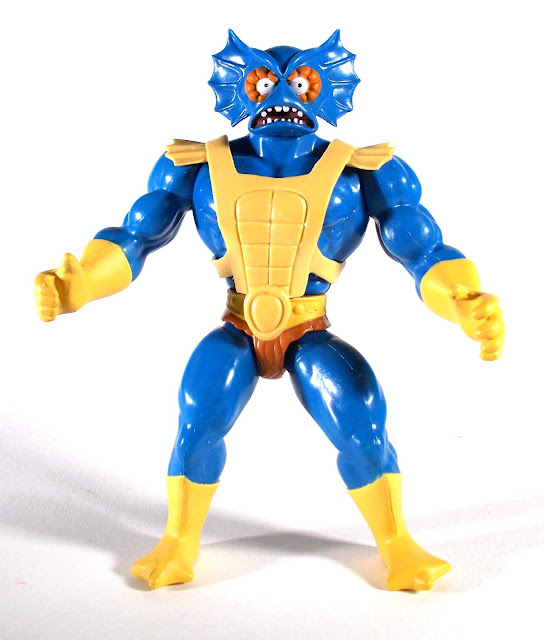 Articulation replicates the original MOTU more or less: fine by 80s standards but quite limited compared to what you get today. The head rotates completely at the neck. Both arms rotate completely at the shoulder thanks to a bit of flexibility in the fishy epaulettes. The waist turns as part of the trademark "power punch" action feature, snapping back when you turn the torso either left or right. The punch action isn't as violent as on previous figures, so there's no worrying about him slinging a weapon into the front parlour. Both legs rotate and pivot at the hip instead of the old rubber band system. They're inserted straight into the hip joint and pivot out sideways with no bother at all, although the left leg is a little loose, and the figure never wants to stand with both feet down. It doesn't affect the figure standing too badly- it does stand- but maybe get some of those 3D printed MOTU stands you see on ebay or from
